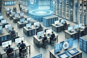この画像は、現代的な図書館やアーカイブ室を表しており、サーバーやコンピュータステーションが並び、ホログラフィックディスプレイやタッチスクリーンに様々な文書や画像、アーティファクトが表示されています。人々がデジタルスクリーンを操作し、情報にアクセスし整理している様子が描かれています。先進的な技術を駆使したデジタルアーカイブの環境が表現されています。