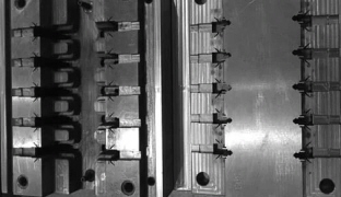 プラスチックやガラスを膨らませて中空の製品を作る金型。