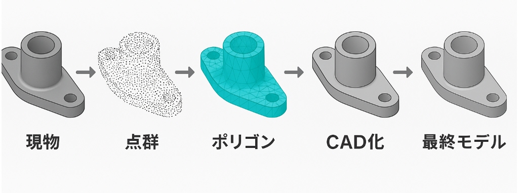 | 現物 → 点群 → ポリゴン → CAD化 → 最終モデル |
